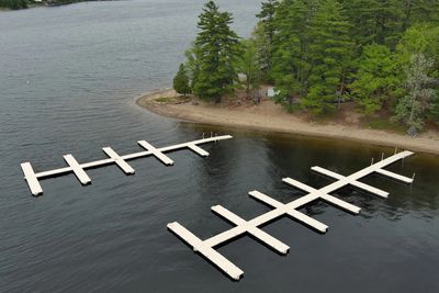 (9) A 5'x45' adjustable screw leg Shore Side Docks aluminum dock with removable Ashwood gray PVC panel decking installed at Young Life Saranac Village Camp on Upper Saranac Lake.
